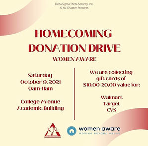To kick-off homecoming in 2022, the Xi Nu Chapter partnered with Women Aware in honor of Domestic Violence month. Gift cards totaling over $800 were collected and presented to Women Aware.